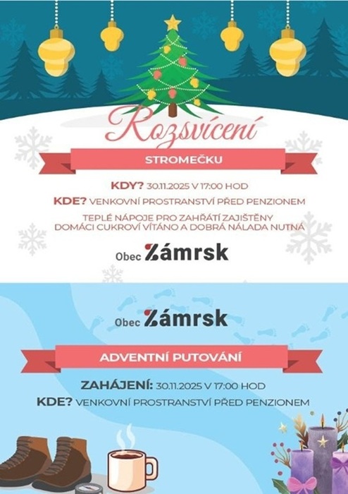 Pojďme v neděli 30. listopadu od 17:00 hod. na prostranství u Penzionu společně rozsvítit stromeček a přivítat první adventní neděli a nasát vánoční atmosféru. Také se odstartuje první adventní putování. Teplé nápoje na zahřátí zajištěno a cukroví je vítáno.